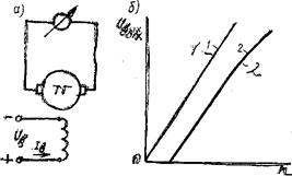 Тахогенераторы постоянного тока служат для измерения частоты вращения по значению выходного напряжения, а также для получения электрических сигналов, пропорциональных частоте вращения вала в схемах автоматического регулирования. Тахогенератор постоянного тока представляет собой генератор малой мощности с электромагнитным независимым возбуждением (рис. 30.3, а) или с возбуждением постоянными магнитами. Ввиду того что при постоянном токе возбуждения Iв = const магнитный поток Ф практически не зависит от нагрузки, выходная ЭДС тахогенератора ЕвЬ1Х прямо пропорциональна частоте вращения: Eвых = СеФn = с'еn, (30.5) где с'е — СеФ = const. Формула (30.5) справедлива и для тахогенератора с возбуждением постоянными магнитами, где Ф = const. Для измерения частоты вращения тахогенератором вал последнего механически соединяют с валом механизма, частоту вращения которого требуется измерить. На выводы тахогенератора подключают измерительный прибор со шкалой, градуированной в единицах частоты вращения. Точность работы тахогенератора определяется его выходной характеристикой, представляющей собой зависимость выходного напряжения от частоты вращения п при неизменном значении сопротивления нагрузки. Наиболее точная работа тахогенератора соответствует прямолинейной выходной характеристике (рис. 30.3, б, прямая 1). Однако в реальных тахогенераторах выходная характеристика не прямолинейна (график 2) и к тому же она выходит не из начала осей координат. Основная причина криволинейности характеристики — реакция якоря, поэтому уменьшению криволинейности этой характеристики способствует включение на выход тахогенератора приборов с большим внутренним сопротивлением,