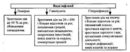 Інфляція є одним із проявів макроекономічної нестабільності і характеризується зростанням загального рівня цін упродовж певного періоду часу, яке супроводжується знеціненням національної грошової одиниці. Спочатку інфляцію тлумачили виключно як грошове явище, в якому всяка зміна кількості грошей в обігу призводить до пропорційної зміни абсолютного рівня цін на товари, послуги. Марксистська теорія інфляції ґрунтується на твердженні, що золоті гроші не знецінюються, інфляція виникає тоді, коли паперових грошей, які замінюють в обігу золоті, випущено більше золотого еквіваленту. Відповідно до кейнсіанської теорії інфляційного розриву, інфляція виникає, якщо сукупні видатки перевищують обсяг національного продукту. Представники монетаризму вважають, що причиною інфляції є вищі темпи приросту грошової маси порівняно з темпами зростання ВВП. Макроекономіка розглядає інфляцію як багатофакторний процес, тобто причини її виникнення різні: надмірне зростання грошової маси порівняно зростом національного продукту, дефіцит державного бюджету, мілітаризація економіки, монополізм, структура економіки. Залежно від рівня змін розрізняють три види інфляції: помірну, галопуючу та гіперінфляцію (рис. 26).
