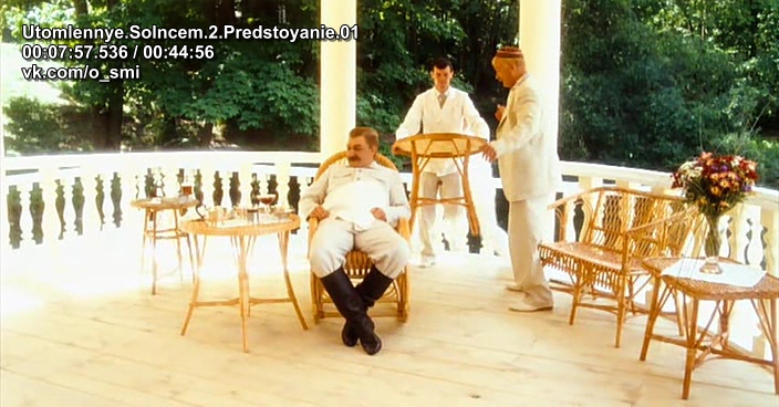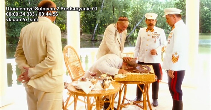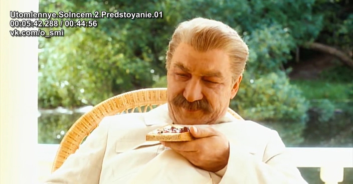 Принесли торт с профилем Сталина. Он в этом фильме целых два раза показан, как наблюдательный, на этом его положительные качества, по мнению Михалкова, заканчиваются. Посмотрев на рисунок, дает нож Будённому и говорит: «Съедим дружно товарища Сталина?». Будённый хотел переложить проблемы на Ворошилова и Берию, дав им нож, но один спрятал руки в карманы, а другой убрал их за спину. Второй раз один и тот же информационный посыл. Михалков любит повторять, чтобы лучше внушить. Мы это еще увидим.
