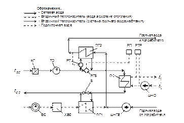 Качественное регулирование предполагает изменение температуры прямой сетевой воды с изменением температуры наружного воздуха. Приведенные в задании параметры греющего теплоносителя соответствуют пиковому расчетному режиму работы теплосети при расчетной температуре наружного воздуха для системы отопления, которая представляет собой среднюю температуру наиболее холодной пятидневки года в данной местности по восьми самым холодным зимам за 50 лет; аналогичная расчетная температура для систем вентиляции - это средняя температура самого холодного месяца года (января). Для ряда городов эти температуры приведены в табл. 1.1.