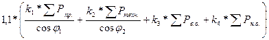 P= k1 – k4 – коэффициент спроса мощности, соответствующий потр k1=0.7; k2=0.8; k3=0.9; k4=1 cosφ1,, cosj2 – средний коэффициент корректировки мощности по групппам потребителей. 1.1 – коэффициент, учитывающий потери мощности в сети cosj1 Для электродвигателей cosj1 £ 0.7 Для технологических нужд cosj2 = 0.8 ∑Рпр. – (сумма производственная), сумма номинальных мощностей всех установленных моторов. ∑Ртехн.– (сумма техническая), сумма номинальных мощностей на технологические нуж- ды (прогрев кирпича, бетонной смеси, раствора, только для зимнего времени). ∑Рв.о.– общая мощность осветительных приборов внутреннего освещения. ∑Рн.о. – общая мощность осветительных приборов для наружного освещения. Башенный кран КБ 403 – 60,5 кВт Компрессор сварочного аппарата – 6кВт Электроинструменты – 4кВт Растворонасос – 2кВт Растворосмеситель – 2кВт Ртехн= 0 Рпр.= 60,5 + 6 + 4 + 2 + 2=75,0 кВт åРв.о.= Р1 + Р2 + Р3 + Р4 + Р5 Р1– освещение прорабской, норма освещения 1,5 кВт на 100м2. Р1= Р3 – освещение столовой, норма освещения 1кВт на 100м2. Р3 = Р4 – освещение закрытого склада, норма освещения 0,5кВт на 100м2. Р4= Р5 – освещение туалета, норма освещения 0,5кВт на 100м2. Р5= åРв.о.=0,27+0,76+0,03+0,14+0,12=1,32 кВт åРн.о.=Р6 + Р7 + Р8 + Р9 + Р10 Р6 – освещение рабочего места плотника Р6= Р7 – освещение рабочего места монтажника Р7= Р8 – освещение открытых складов Р8= Р9 – освещение дороги Р9= Р10 – охранное освещение по забору Р10= å Рн.о.=0,23+0,08+0,18+0,073+0,19=0,75 кВт Р