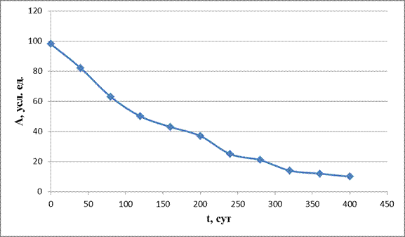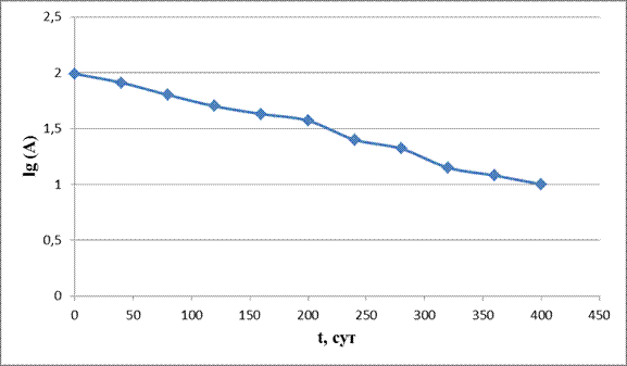 Далее строим график регрессивной зависимости в координатах lg (A) и t.