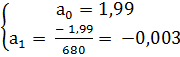Согласно полученному графику линия регрессии пересекает оси координат приблизительно в точках А1 (0; 1,99), А2 (680; 0). Эти точки удовлетворяют уравнению прямой: Х = а0 + а1t