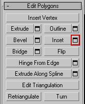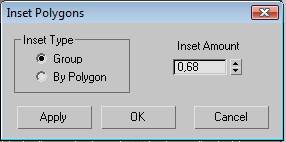 8. Нажмем на квадратик напротив Inset (Врезка), чтобы создать дополнительный набор ребер на некотором расстоянии от наружных краев полигона. В открывшемся окне Insert Polygons (Врезка полигонов) величину в поле Inset Amount (Величина врезки) подберите самостоятельно, наблюдая, как в окнах проекций появляются новые ребра, смещенные относительно краев полигона.
