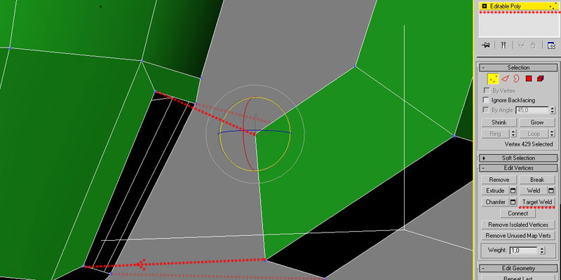 8. Далее перейдем на уровень вершин и выберем команду (рис. 6) Target weld. Эта команда позволяет направленно склеивать вершины. Выбираем первую вершину, от нее потянуться след ко второй, клик на второй, и вершина номер один склеилась со второй. Последовательно склеиваем все вершины тем самым, закрывая отверстие.