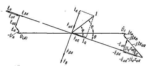 Рис. 4-76. Диаграмма явнополюсного двигателя, работающего с отстающим током. На рис. 4-75 и 4-76 видно, что реакция в синхронном двигателе при опережающем токе является размагничивающей ( Это не противоречит выводам, полученным при рассмотрении реакции якоря генератора (см. § 4-3, а). Действительно, на рис. 4-75 видно, что синхронный двигатель, работающий с опережающим током, имеет продольную составляющую тока Мы здесь не будем приводить диаграммы неявнополюсного двигателя. Их построение производится в том же порядке, что и для неявнополюсного генератора. Date: 2015-09-05; view: 421; Нарушение авторских прав |