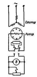 Рис. 4-82. Схема синхронного двигателя (при асинхронном пуске в ходе). После включения двигателя в нем образуется вращающееся поле. Взаимодействие его с токами, наведенными в пусковой клетке, создает вращающий момент, так же как в короткозамкнутом асинхронном двигателе. Обмотка возбуждения при этом должна быть замкнута, так как в противном случае в ней наводилась бы вращающимся полем большая э.д.с., опасная не только для изоляции обмотки, но и для обслуживающего персонала. Ее замыкают для увеличения пускового момента на сопротивление, приблизительно в 8 Синхронный двигатель, вращаясь как асинхронный, доходит почти до синхронной частоты. Получающееся при этом скольжение зависит от нагрузки на валу и от параметров электрических цепей ротора. Вхождение в синхронизм достигается после включения постоянного тока в обмотку возбуждения под действием возникающего при этом синхронизирующего момента (переключатель на рис. 4-82 должен быть включен вниз).