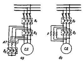 При асинхронном пуске в ход синхронных двигателей они обычно непосредственно подключаются к сети, если мощность сети достаточно велика и для нее допустимы большие пусковые токи, которые достигают в начале пуска 5¸6-кратных значений по сравнению с номинальными. Если же необходимо уменьшить пусковые токи, то пуск производится при пониженном напряжении, так же как мощных асинхронных короткозамкнутых двигателей. Здесь также применяется пуск при переключении обмотки статора со звезды на треугольник, что дает уменьшение фазного напряжения при пуске в