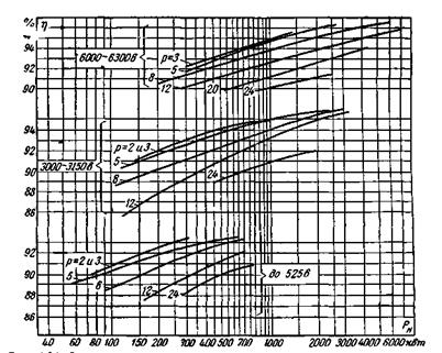 Рис. 4-94. Значения к.п.д. (η) синхронных генераторов и двигателей при номинальном режиме их работы в зависимости от номинальной мощности Р н. Значения к.п.д. крупных гидрогенераторов колеблются в пределах 96 4-14. Нагревание и охлаждение Нагревание отдельных частей синхронной машины обусловлено потерями, возникающими в ней при ее работе. Установившиеся превышения температуры этих частей, так же как и для асинхронной машины, не должны превышать определенных пределов, зависящих от класса изоляционных материалов, примененных для ее обмоток. Для изоляции обмоток статора и ротора гидрогенераторов мощностью 1000 кВА и выше, а также гидрогенераторов напряжением 6300 В и выше независимо от мощности применяются изолирующие материалы класса В, причем эти материалы подвергаются пропитке асфальтобитумным составом. В этом случае допускается превышение температуры обмотки статора не выше 70°С при температуре охлаждающего воздуха 35°С. Допускаемое превышение температуры обмотки возбуждения в случае, если она выполняется из полосовой голой меди, намотанной на ребро в один ряд с прокладками между витками из изолирующего материала класса В, принимается равным 95°С. Для изоляции обмоток статора и ротора турбогенератора применяются, как правило, изолирующие материалы класса В. При температуре охлаждающего газа (воздуха или водорода) 40°С допускаются следующие превышения температуры: для обмотки статора, пропитанной асфальтобитумным составом, 65°С, для обмотки ротора 90°С и для активной стали 65°С. Охлаждение электрической машины, как ранее указывалось, осуществляется главным образом посредством обдувания ее нагретых поверхностей воздухом. Охлаждение должно быть тем интенсивнее, чем больше мощность машины. Количество воздуха, которое необходимо прогнать через машину для ее охлаждения, тем больше, чем больше в ней потери. Оно может быть подсчитано, м3/с,