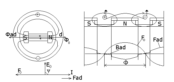 Здесь также действительную кривую распределения индукции заменяют эквивалентной синусоидой. F1ad=Fad*Kd, где Kd – коэфициент продольной реакции якоря. Kd=0.8-0.95 таким образом, при индуктивной нагрузке реакция якоря будет продольной и будет действовать размагничивающим образом.