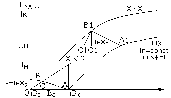 Для определения этого параметра необходимо иметь следующие характеристики: 1. Характеристика холостого хода E0=f(iB), I=0. 2. Нагрузочную индукционную характеристику U=f(iB), Iн = const, cosφ = 0. 3. Характеристика трехфазного, короткого замыкания Iн=f(iB), U=0. Эти характеристики представлены на рис. 18.