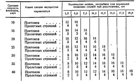 Основным способом транспортировки материальной части является перевозка автомобилями. Обычно перевозка производится на расстояния до 200 — 250 км от места выгрузки с железнодорожного подвижного состава или баз хранения до района наводки моста или организации паромной переправы. В отдельных,случаях может оказаться целесообразной автоперевозка на расстояния в 500 км и даже более. Перевозка на большие расстояния с использованием автомобилей большой грузоподъемности КрАЗ-258, КрАЗ-257Б, лесовозных автомобилей КрАЗ-255Л, МАЗ-509 с прицепами - роспусками ТМЗ-803К или универсальных автопоездов АНС-10У дает возможность сократить число автомобилей для перевозки комплекта НЖМ-56 одним рейсом ориентировочно на 100 единиц.Перевозка конструкций на большие расстояния должна предусматриваться ротными или взводными автомобильными колоннами с соблюдением уставных положений. В составе колонны следует перевозить имущество на целое число мостовых паромов или как исключение на целое число пролетов моста. Примерный расчет количества автомобилей, потребного для одновременной перевозки имущества парка НЖМ-56 приведен в таблице 2.