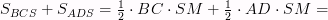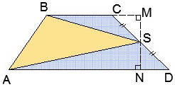Иногда я предлагаю задачи на весьма хитрый путь нахождении я площади трапеции. Я отношу его к спецприемам ибо на практике репетитор их использует крайне редко. Если вам нужна подготовка к ЕГЭ по математике только в части B, можно про них и не читать. Для остальных рассказываю дальше. Оказывается площадь трапеции в два раза больше площади треугольника с вершинами в концах одной боковой стороны и серединой другой, то есть треугольника ABS на рисунке: