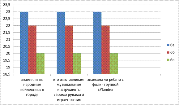 Из ответов можно сделать вывод, что не все знакомы с народными коллективами, но и вообще не знают об их существовании, поэтому основная наша работа была направлена на ознакомление с народными коллективами и конкретно с коллективом «Ylande». На уроках музыки мы подробно рассказывали о музыкантах, о том, что группа мастерит музыкальные инструменты своими руками и играют на них во время выступлений. Слушали песни в исполнении группы, смотрели видеозаписи их выступлений, которые проходили в городе Калачинске. Некоторые ученики гимназии слышали песни группы на фестивале «Никола зимний» и на конкурсе патриотической песни «Ради жизни на земле», поэтому результат следующего анкетирования показал результат выше.