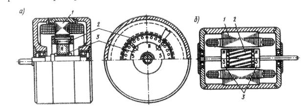 Рис. 23.1. Магнитоэлектрические синхронные двигатели с радиальным (а) и аксиальным (б) расположением постоянных магнитов: 1 — статор, 2 — короткозамкнутый ротор, 3 — постоянный магнит Таким образом, при разгоне двигателя с постоянными магнитами на его ротор действуют два асинхронных момента (рис. 23.2): вращающий Однако зависимость этих моментов от частоты вращения ротора (скольжения) различна: максимум вращающего момента Для обеспечения надежного пуска двигателя необходимо, чтобы минимальный результирующий момент в асинхронном режиме