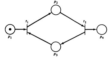 которое имеет решение х = (0, 4, 5). Это соответствует, например, последовательности Матричный подход к анализу сетей Петри очень перспективен, но имеет и некоторые трудности. Заметим прежде всего, что матрица D сама по себе не полностью отражает структуру сети Петри. Переходы, имеющие как входы, так и выходы из одной позиции (петли), представляются соответствующими элементами матриц Другая проблема — это отсутствие информации о последовательности запусков. Еще одна трудность заключается в том, что наличие целочисленного решения уравнения (5.6) является необходимым для достижимости, но недостаточным. Рассмотрим простую сеть Петри, приведенную на рис. 5.2. Если мы хотим определить, является ли маркировка (0, 0, 0, 1) достижимой из маркировки (1, 0, 0, 0), необходимо решить уравнение