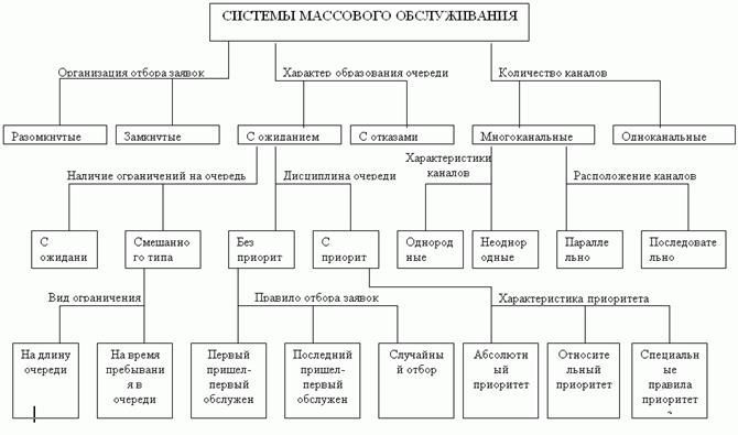 Рис.1: Классификация систем массового обслуживания. . К замкнутым относятся системы, в которых поступающий поток требований ограничен. Например, мастер, задачей которого является наладка станков в цехе, должен периодически их обслуживать. Каждый налаженный станок становится в будущем потенциальным источником требований на подналадку. В подобных системах общее число циркулирующих требований конечно и чаще всего постоянно. Если питающий источник обладает бесконечным числом требований, то системы называются разомкнутыми. Примерами подобных систем могут служить магазины, кассы вокзалов, портов и др. Для этих систем поступающий поток требований можно считать неограниченным. Под дисциплиной подключения каналов к обслуживанию понимают правила, по которым обслуживающие приборы подключаются к обслуживанию поступающих заявок, при этом все заявки считаются равноценными, с этой точки зрения различают две разновидности СМО: системы со взаимопомощью между каналами обслуживания и системы без взаимопомощи. Встречаются СМО, в которых для ускорения процесса обслуживания допускается подключение нескольких каналов к работе над одной заявкой. Например, два или несколько рабочих могут одновременно ремонтировать один станок или автомашину, по одному самолету может стрелять несколько зенитных орудий, вычисления для одной задачи могут быть, распараллелены между несколькими ЭВМ Многофазными называются СМО, которые состоят из нескольких последовательно соединенных отдельных подсистем массового обслуживания, причем входящий поток каждой последующей подсистемы является выходящим потоком предыдущей. Характеристики СМО. 1. Среднее число требований, поступающих в систему обслуживания за единицу времени, называется интенсивностью поступления требований иопределяется следующим соотношением: 2. Интенсивность обслуживания среднее число требований, обслуженных системой за единицу времени 3. Коэффициент загрузки: 4. Вероятность того, что поступающее в систему требование откажется присоединяться к очереди и теряется, Ротк. Этот показатель для системы массового обслуживания с отказами равен вероятности того, что в системе находится столько требований, сколько она содержит каналов обслуживания: Ротк = Pm, где т — число каналов обслуживания. Для системы с ограниченной длиной очереди Ротк равно вероятности того, что в системе находится т +l требований: Ротк = Pm+l, где l — допустимая длина очереди. Противоположным показателем является вероятность обслуживания требования Робсл = 1- Pотк. 5. Среднее количество требований, ожидающих начала обслуживания (средняя длина очереди): 6. Относительная (q) и абсолютная (А) пропускные способности системы. Эти величины находят соответственно по формулам: q = 1 - Ротк, A = λ. 7. Среднее число занятых обслуживанием приборов mз. Для системы массового обслуживания с отказами mз можно найти по формуле 8. Общее количество требований, находящихся в системе (М). Эту величину определяют следующим образом. Для систем массового обслуживания с отказами М = mз. Для систем массового обслуживания с ограниченной длиной очереди и ожиданием М = mз + Мож. 9. Среднее время ожидания требованиям начала обслуживания (Тож). Если известна функция распределения вероятности времени ожидания требованиям начала обслуживания Показатели, характер