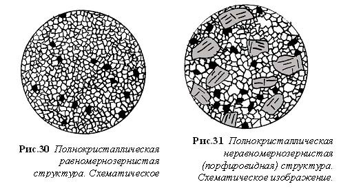 Структура магматических пород. Под структурой (лат. structura - строение, расположение, порядок), подразумеваются те особенности строения горной породы, которые обусловливаются размером, формой и взаимными отношениями составных частей (кристаллов и вулканического стекла, там где оно имеется). Структурные признаки магматических пород зависят от степени их кристалличности и связаны с условиями кристаллизации магмы. Различают полнокристаллическую, неполнокристаллическую и стекловатую структуры магматических горных пород (табл.2). Полнокристаллическая (зернистая) – порода сложена исключительно кристаллами различных минералов и не содержит вулканического стекла. По относительной величине кристаллов полнокристаллическая структура бывает равномернозернистой и неравномернозернистой (рис. 30, 31). Таблица 2