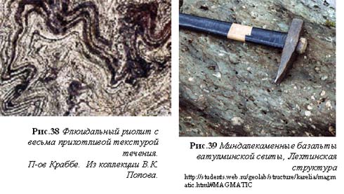 Флюидальная (текучая) текстура образуется в результате течения застывающей лавы, когда минералы в породы ориентируются по направлению движения лавового потока (рис. 38). Присуща многим эффузивным породам. Миндалевидная (миндалекаменная) текстура возникает при заполнении пустот вторичными минералами. Миндалины обычно заполнены хлоритом, эпидотом, кальцитом, кварцем и другими вторичными минералами (рис. 39).