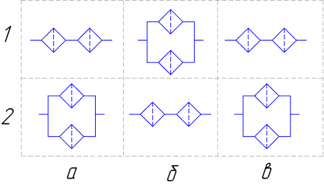 Рисунок 14 – Типы соединения элементов в ССН: а – монтажное соединение; б – ССН разрыв сетки; в – ССН засорение сетки В случае последовательного монтажа соединения фильтров (1-а) ССН в зависимости от типа отказа может быть как параллельной, так и последовательной (1-б). При последовательном монтаже работоспособность привода нарушается при разрыве сетки в обоих фильтрах или засорением сетки в одном фильтре. При засорении одного из фильтров последовательного монтажа гидросистема становится неработоспособной, а структурная схема изображается последовательным соединением (1-в). Вероятность безотказной работы последовательного соединения элементов согласно теореме умножения случайных событий равна произведению вероятностей появления всех событий:
