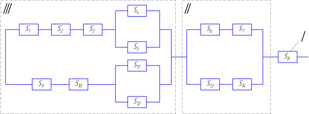 Правильность ССН проверяется согласно принципу прохождения сигналов: сигналы проходят только по исправным элементам (отказавший элемент сигнал не пропускает). При последовательном соединении элементов сигнал с входа до выхода при отказе хотя бы одного элемента не проходит. При параллельном соединении для прохождения сигнала достаточно иметь хотя бы одну исправную ветвь. В процессе эксплуатации интенсивность отказов не зависит от времени, и справедлив экспоненциальный закон надежности Вероятность безотказной работы последовательного соединения n элементов с учетом экспоненциального закона имеет вид: