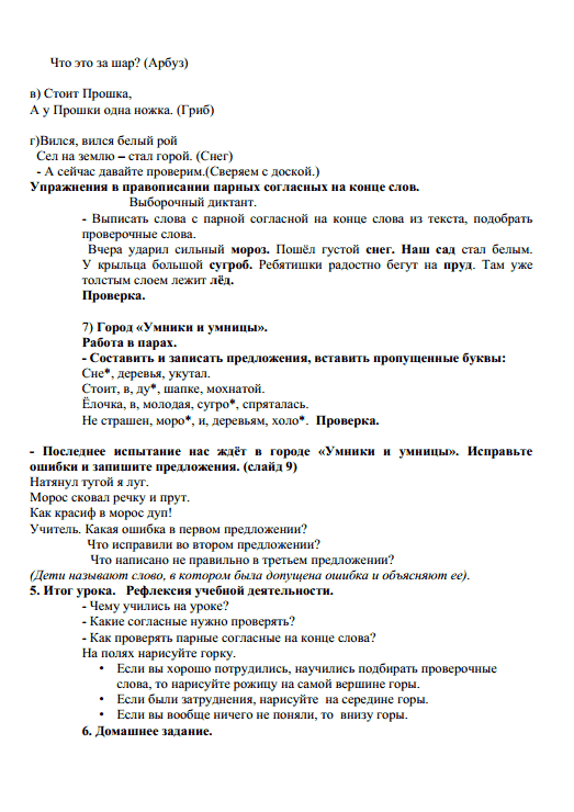 8.Физминутка под музыку польки. 9.Включение нового знания в систему знаний. -На бал пришла гостья. Её лицо скрыто под маской. Узнаем, кто это, если выполним задание. Вставить пропущенные буквы в слова, составить и записать предложение. А вот неожиданная пара! (карточка с названием слов бал-балл) -Чем отличаются эти слова? Произнесите их. Что заметили? Что обозначает слово балл? (Работа с толковым словарём) Слова, которые произносятся одинаково, но имеют разноезначение, называются омофоны. Задание для любознательных: придумать свои примеры омофонов. 10.Организация рефлексии. -Какую проблему на уроке мы решали? Удалось достичь поставленную цель? -Какое задание понравилось? Что было трудно? Как это преодолеть? Оценим работу на уроке. Кого мы можем похвалить? Выходят ребята с солнечными лучиками и зажигают солнышко. -Я благодарю вас за работу, вы все заслужили отметки 5 баллов. Спасибо за помощь в проведении урока. Литература: 1.Сборник рабочих программ «Школа России», Москва «Просвещение» 2011 2.Канакина В.П., Горецкий В.Г. Русский язык: Учебник для общеобразовательных учреждений: в 2ч. М.: Просвещение 2012г. Интернет-ресурсы. Самоанализ открытого урока по русскому языку 2 класс Данный урок разработан на основе Федерального государственного образовательного стандарта начального общего образования по русскому языку, Концепции духовно-нравственного развития и воспитания личности гражданина России, планируемых результатов начального общего образования, УМК «Школа России»
