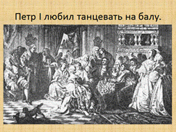 -Традиция устраивать балы существует в Санкт-Петербурге давно. По замыслу Петра Первого на аллеях Летнего сада проводились роскошные балы и гуляния. Пётр Первый с удовольствием танцевал! (слайд№4)