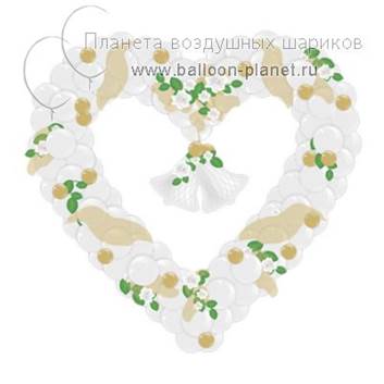 Сердце из шаров №7 Большое сердце из воздушных шаров белого цвета украшенное зеленью. Фольгированное сердце внутри большего имеет размеры около 80 см, на нем, по желанию могут быть нанесены имена молодоженов либо пожелания. Цена: 3 290 руб.Особенности: Сердце имеет размер около 160*130 см. Цвет шаров может быть любой на ваш выбор. Количество шаров в сердце около 230 шт.