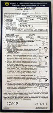 2. Таможенная декларация. Обязательно к заполнению. Ее нужно будет отдать, при прохождении проверки багажа. 1. Arrival Date —дата вашего прилета на Бали. 2. Flight — номер рейса. 3. Full Name — имя и фамилия, как в загранпаспорте. 4. Nationality — Национальность (Укажите вашу национальность). 5. Passport number — серия и номер загранпаспорта. 6. Occupation — род занятий (учитель-Teacher, student-студент, businessman- бизнесмен, engineer-инженер, doctor- врач, clerk-служащий и др.). 7. Address in Indonesia — адрес вашего планируемого проживания или 8. Number of accompanying members — сопровождаете ли Вы кого то (указать кол-во). 9. Number of accompanied baggage — количество сданного багажа. 10. по 15. - отметить - (No).