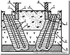 1 — существующий фундамент, имеющий вертикальные и горизонтальные трещины; 2 — трещины; 3 — кирпичная стена; 4 — инъектор для нагнетания компаунда из синтетических смол под давлением 0,6-1,2 МПа; 5 — борозда шириной 35-40 мм, выполненная дисковой пилой или отбойным молотком; 6 — отверстие, пробуренное перфоратором на глубину 100-150 мм. РИС.5: УСТРОЙСТВО ЖЕЛЕЗОБЕТОННОЙ ОБОЙМЫ ДЛЯ ЛЕНТОЧНОГО БУТОВОГО ИЛИ КИРПИЧНОГО ФУНДАМЕНТА