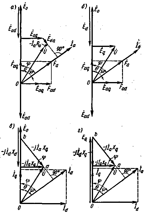 Величину X сн = Х а + Х ва называют полным или синхронным индуктивным сопротивлением машины. Упрощенная векторная диаграмма и схема замещения, соответствующие уравнению (6.15), изображены на рис. 6.25, б,в; их широко используют при качественном анализе работы синхронной машины. Необходимо, однако, отметить, что при определении Е 0 по упрощенной диаграмме получается несколько большее значение, чем по точной диаграмме (см. рис. 6.24, а), в которой учитывается насыщение. Угол θ между векторами Ú и É 0 называют углом нагрузки. При работе синхронной машины в генераторном режиме напряжение U всегда отстает от ЭДС Е 0, в этом случае угол θ считается положительным. Чем больше нагрузка генератора (отдаваемая им мощность), тем больше угол θ. Явнополюсный генератор. Упрощенную диаграмму синхронной явнополюсной машины можно также построить по общему уравнению (6.12), которое с учетом (6.9) принимает вид (6.16) Ú = É + É σa - Í a R a = É 0 + É аd + É аq + É σa - Í a R a. На рис. 6.26,а приведена векторная диаграмма, соответствующая уравнению (6.16). Если пренебречь малой величиной R a, то (6.17) Ú = É 0 + É аd + É аq + É σa. ЭДС E σa, индуцируемую в обмотке якоря потоком рассеяния, можно представить в виде суммы двух составляющих, ориентированных по осям d-d и q-q: (6.18) É σa = É σad + É σaq, где (6.19) É σad = - jÍ d X σa; É σaq = - jÍ q X σa, или E σad = E σa sin ψ = I a X σa sin ψ = I d X σa; Е σaq = E σa cos ψ = I a X σa cos ψ = I q X σa. С учетом (6.18) вместо (6.17) получим (6.20) Ú = É 0 + É аd + É аq + É σad + É σaq = É 0 + É d + É q, где É d = É аd + É σad; É q = É аq + É σaq. Векторная диаграмма, построенная по (6.20), приведена на рис. 6.26, б. Заменим ЭДС соответствующими индуктивными падениями напряжения: Ú = É 0 - jÍ d X ad - jÍ q X aq - jÍ d X σa - jÍ q X σa, или (6.21) Ú = É 0 - jÍ d X d - jÍ q X q, где X d = X ad + X σa; X q = Х aq + X σa.