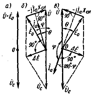Так как U = U c = const, то силу тока I а можно изменять только двумя способами — изменяя ЭДС Е 0 по величине или по фазе. Если к валу генератора приложить внешний момент, больший момента, необходимого для компенсации магнитных потерь мощности в стали и механических потерь, то ротор приобретает ускорение, вследствие чего вектор É 0 смещается относительно вектора Ú на некоторый угол θ в направлении вращения векторов (рис. 6.33, б). При этом возникает некоторая небалансная ЭДС Δ Е, приводящая согласно (6.28) к появлению тока I а. Возникающую небалансную ЭДС Δ É = É 0 - Ú = É 0 + Ú c = j Í a X сн можно показать на векторной диаграмме (рис. 6.33, б). Вектор тока I а отстает от вектора Δ Е на 90°, поскольку его величина и направление определяются индуктивным сопротивлением X сн. При работе в рассматриваемом режиме генератор отдает в сеть активную мощность Р = mUI a cos φ и на вал его действует электромагнитный тормозной момент, который уравновешивает вращающий момент первичного двигателя, вследствие чего частота вращения ротора остается неизменной. Чем больше внешний момент, приложенный к валу генератора, тем больше угол θ, а следовательно, ток и мощность, отдаваемые генератором в сеть. Если к валу ротора приложить внешний тормозной момент, то вектор É 0 будет отставать от вектора напряжения Ú на угол θ (рис. 6.33, в). При этом возникают небалансная ЭДС Δ É и ток Ía, вектор которого отстает от вектора Δ É на 90°. Так как угол φ > 90°, активная составляющая тока находится в противофазе с напряжением генератора. Следовательно, в рассматриваемом режиме активная мощность Р = mUI a cos φ забирается из сети, и машина работает двигателем, создавая электромагнитный вращающий момент, который уравновешивает внешний тормозной момент; частота вращения ротора при этом снова остается неизменной. Таким образом, для увеличения нагрузки генератора необходимо увеличивать приложенный к его валу внешний момент (т. е. вращающий момент первичного двигателя), а для уменьшения нагрузки — уменьшать этот момент. При изменении направления внешнего момента (если вал ротора не вращать, а тормозить) машина автоматически переходит из генераторного в двигательный режим. Регулирование реактивной мощности. Если в машине, подключенной к сети и работающей в режиме холостого хода (рис. 6.34, а), увеличить ток возбуждения I в, то возрастет ЭДС Е 0 (рис. 6.34, б),возникнет небалансная ЭДС Δ É = - jIаX сн и по обмотке якоря будет проходить ток I а, который согласно (6.28) определяется только индуктивным сопротивлением Х сн машины. Следовательно, ток Í a реактивный: он отстает по фазе от напряжения Ú на угол 90° или опережает на тот же угол напряжение сети Ú c. При уменьшении тока возбуждения ток Í a изменяет свое направление: он опережает на 90° напряжение Ú (рис. 6.34, в) и отстает на 90° от напряжения Ú c.Таким образом, при изменении тока возбуждения изменяется лишь реактивная составляющая тока I а, т. е. реактивная мощность машины Q. Активная составляющая тока Iа в рассматриваемых случаях равна нулю. Следовательно, активная мощность Р = 0, и машина работает в режиме холостого хода. При работе машины под нагрузкой создаются те же условия: при изменении тока возбуждения изменяется лишь реактивная составляющая тока Iа, т. е. реактивная мощность машины Q. Режим возбуждения синхронной машины с током I в.п, при
