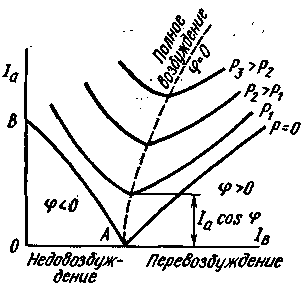 Приведенные диаграммы показывают, что при изменении внешнего момента, приложенного к валу синхронного генератора, работающего параллельно с сетью, изменяется не только активная, но и реактивная мощность. Следовательно, для того чтобы обеспечить наиболее благоприятный или требуемый режим работы генератора, при изменении активной мощности необходимо регулировать и ток возбуждения. Работа генератора с неизменным моментом. Неизменность внешнего момента на валу генератора эквивалентна неизменности его мощности Р = mUI a cos φ. При работе на сеть большой мощности U = U с = const, следовательно, при изменении тока возбуждения остается постоянной активная составляющая тока якоря I a cos φ = const. На векторной диаграмме (рис. 6.35, б) это условие выражается в том, что конец вектора Í а скользит по прямой АВ, перпендикулярной вектору напряжения Ú. Однако при неизменной мощности (для машины с неявновыраженными полюсами) справедливо условие