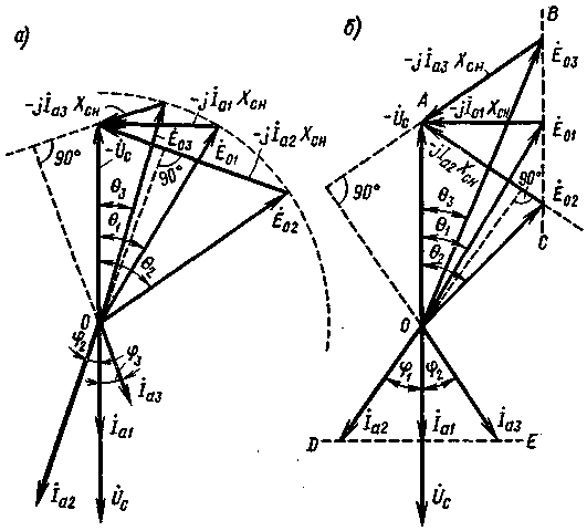 Следовательно, изменение активной мощности синхронного двигателя приводит к изменению его cos φ: при уменьшении нагрузки вектор тока поворачивается в сторону опережения и двигатель может работать с cos φ = 1 или с опережающим током; при увеличении нагрузки вектор тока поворачивается в сторону отставания. Аналогично строят диаграмму при увеличении тока возбуждения. В этом случае ЭДС É 0возрастает до величины É 03 и угол θ3 становится меньшим θ1. Вектор - jÍ a 3 X сн поворачивается вокруг точки А и соответственно ему изменяет направление вектор тока Ía 3, перпендикулярный вектору - jÍ a 3 X сн, при этом из условия равенства активных мощностей I a 1 cos φ1 = I a 2cos φ2 = I a 3 cos φ3 конец вектора тока Í a перемещается по прямой DE, перпендикулярной вектору U c. По диаграмме, приведенной на рис. 6.46, б, можно построить U -образные характеристики для двигателя I a =f (I в), которые будут иметь такую же форму, как и характеристики для генератора (см. рис. 6,36), с тем лишь отличием, что для двигателя угол сдвига фаз φ принято отсчитывать от вектора напряжения
