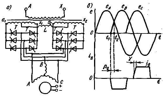 Для того чтобы двигатель работал при cos φ = 1, вектор тока Í a должен опережать вектор ЭДС É 0 на угол β0, который в зависимости от нагрузки составляет 30—60°. Пусковой момент вентильного двигателя максимален при β0 = 0, поэтому в электроприводах с тяжелыми условиями пуска сначала регулирование ведут при β0 = 0, а с возрастанием частоты вращения начинают задавать некоторый угол опережения. При необходимости питания вентильного двигателя от сети трехфазного тока можно применять преобразователи частоты с непосредственной связью, т. е. без промежуточного выпрямителя (рис. 6.52, а). Преимуществом таких преобразователей является отсутствие узлов принудительной коммутации, так как тиристоры перестают проводить ток после изменения направления напряжения в соответствующей фазе А с, В с, С с источника трехфазного тока. Однако достаточно хорошее приближение формы выходного напряжения к синусоидеи четкое прекращение тока (в необходимый момент) можно получить только в том случае, если источник трехфазного тока имеет частоту в 2 — 3 раза большую, чем выходная частота преобразователя (рис. 6.52, б).