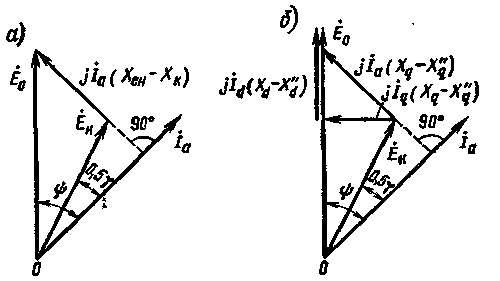 При коммутации одновременно открыты однополярные вентили двух фаз (рис. 6.65), вследствие чего эти фазы оказываются замкнутыми накоротко и ток из одной фазы переходит в другую под действием разности фазных ЭДС. Так как время коммутации вентилей незначительно (доли полупериода), электромагнитные процессы в машине протекают так же, как и на начальном этапе внезапного двухфазного короткого замыкания. Поэтому в качестве сопротивления Х кследует принимать индуктивное сопротивление для этого режима: Хк ≈ 0,25(3Х"d +Х"q), где X "d и Х "q — сверхпереходные индуктивные сопротивления обмотки якоря (см. § 6.17). Физически это означает, что несинусоидальный ток в обмотке якоря создает высшие гармонические МДС якоря и соответствующие потоки, которые индуцируют в демпферной обмотке и обмотке возбуждения высшие гармонические ЭДС и токов. В результате этого форма и величина результирующего магнитного потока машины остаются практически неизменными. Векторная диаграмма. Векторная диаграмма неявнополюсного синхронного генератора, работающего на выпрямительную нагрузку, показана на рис. 6.66, а и соответствует уравнению (6.80) Éк = É0 - jÍa(Xсн - Хк). В качестве тока I а принимается его первая гармоническая; ЭДС Е к и Е 0 практически синусоидальны, так как индуцируются синусоидальным магнитным потоком. Для машины с явно выраженными полюсами векторная диаграмма (рис. 6.66,б) строится по уравнению (6.81) Éк = É0 - jÍd (Xd - X"d) - jÍq (Xq - Х"q). Как следует из векторных диаграмм, при работе генератора на выпрямительную нагрузку за угол φ принимают угол 0,5γ. Вектор первой гармонической напряжения на диаграммах обычно не показывают, так как для генератора, нагруженного на выпрямитель, практически важным является среднее значение выпрямленного напряжения Ú d.