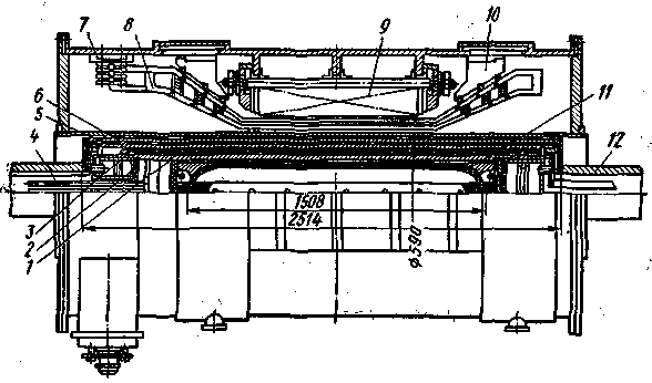 На рис. 6.68 для примера показана конструктивная схема сверхпроводникового генератора мощностью 20 MB•А. Обмотка возбуждения 11 расположена на каркасе, укрепленном на цилиндре 1 из нержавеющей стали; по краям его установлены тепловые мосты 2, которые уменьшают тепловой поток, поступающий в низкотемпературную зону с торцов машины. На тепловых мостах укреплен бронзовый тепловой экран 3; вокруг которого расположена силовая несущая оболочка 6 ротора из титанового сплава с закрепленным электромагнитным медным экраном 5. Тепловая изоляция низкотемпературной зоны осуществляется посредством двух вакуумных зазоров между бандажным цилиндром 1 и тепловым экраном 3 и между тепловым экраном и несущей оболочкой 6 ротора. Бандажный цилиндр обмотки возбуждения воспринимает электромагнитные, центробежные и силовые усилия, действующие на обмотку. Силовая оболочка 6 воспринимает вращают щий момент генератора и усилия, действующие на электромагнитный экран при переходных процессах. Обмотка возбуждения выполнена из прямоугольного провода поперечным сечением 7 мм2, который состоит из 3600 жил, изготовленных из сплава ниобий — титан. Ток к этой обмотке подается по двум токовводам, выполненным из сплетенного круглого медного стержня и охлаждаемым парами гелия. Гелиевая магистраль 4 расположена в центральном аксиальном канале вала 12 ротора. Охлаждение генератора осуществляется по замкнутому циклу путем подачи в ротор жидкого гелия и возвратом его в виде пара в холодильную установку. На статоре 7 расположена обмотка якоря 8 и ферромагнитный шихтованный экран 9. Обмотка якоря и ферромагнитный экран охлаждаются трансформаторным маслом, которое циркулирует по каналам стержней обмотки и экрана и заполняет весь герметизированный объем статора. Масло является изолирующей средой, что упрощает конструкцию изоляции стержней и всей системы охлаждения статора. Обмотка якоря диаметральная двухслойная; стержень состоит из формованных проводов, расположенных в два столбика, между которыми имеется охлаждающий канал. Предусмотрена транспозиция отдельных проводов в стержне по его высоте и ширине. Лобовая часть обмотки якоря закреплена на неметаллическом конусе 10, который может перемещаться в аксиальном направлении при тепловых деформациях. При эксплуатации сверхпроводииковых электрических машин весьма важной операцией является захолаживание ротора. Процесс захолаживания состоит из трех этапов: охлаждение с температуры 300 до 80 К с помощью жидкого азота, вывод азота из полости ротора и охлаждение жидким гелием с температуры 80 до 4,2 К, когда обмотка возбуждения переходит в сверхпроводящее состояние. Date: 2015-09-05; view: 1346; Нарушение авторских прав |