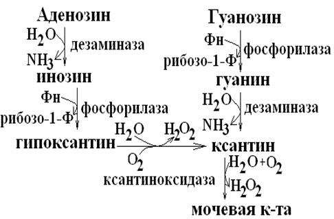 II способ: синтез АМФ и ГМФ из готовых А и Г: 1) А+ФРПФ → АМФ+ФФн Фермент: аденинфосфорибозилтрансфераза 2) Г+ФРПФ→ГМФ+ФФн Гипоксантин+ФРПФ→ ИМФ+ФФн Фермент: гуанин(гипоксантин)фосфорибозилтрансфераза Нарушение синтеза Пуриновых нуклеотидов – синдром Леша-Нихана Причина: генетический дефект ферментов А-ФР-трансферазы и Г(гипоксантин)-ФР-трансферазы. Наследуется Х-сцепленно по рецессивному типу. Проявляется у мальчиков от рождения до 15 лет. Симптомы: все симптомы подагры, гиперурикемия, нарушение координации движений, ДЦП, агрессивность по отношению к себе (кусают губы и пальцы).