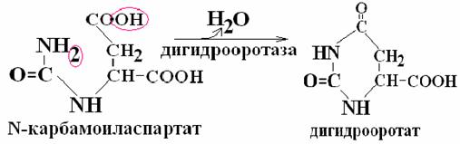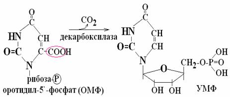Фермент: фосфорибозилпирофосфат (ФРПФ) синтаза. Этот фермент регулирует скорость синтеза пуриновых и пиримидиновые нуклеотидов. Его ингибиротами являются нуклеотиды. Различие: 1. При синтезе пиримидиновых нуклеотидов сначала синтезируется пиримидиновое кольцо – оротовая кислота – которая затем присоединяется к ФРПФ. 2. При синтезе пуриновых нуклеотидов атомы пуринового кольца последовательно присоединяются к ФРПФ. Обмен нуклеотидов, особенно синтез их очень связан с обменом аминокислот. В синтезе пуриновых и пиримидиновых нуклеотидов принимают участие аминокислоты. 4. СИНТЕЗ ПИРИМИДИНОВЫХ НУКЛЕОТИДОВ Происходит в ЦЗ клеток. 1-ая реакция катализируется ферментов карбамоилфосфатсинтаза II (I – в МХ участвует в синтезе мочевины):