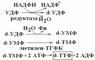 Синтез дезоксиТТФ: Синтез дезоксиТТФ происходит с использованием фермента тиоредоксинредуктазы: