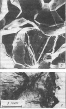 Pис.7. Микроструктура изломов: а - хрупкий скол; б - межзеренный хрупкий скол; в- межзеренное разрушение /двухфазного сплава; г- квазискол; д – разрушение по границам зёрен.