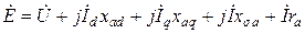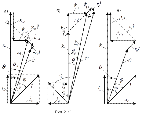 Согласно (3.1,а) фазное напряжение синхронного генератора ( СГ) равно ЭДС возбуждения минус падения напряжения на индуктивных сопротивлениях реакции якоря и на активном сопротивлении цепи якоря. Или согласно (3.2) ЭДС возбуждения равно напряжению на зажимах СГ плюс падения напряжения на индуктивных и активных сопротивлениях. Из предыдущего известно