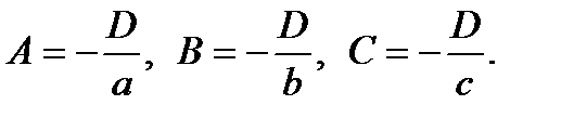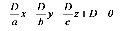 Так как плоскость не проходит через начало координат, то D≠ 0. Так как плоскость отсекает от осей координат ненулевые отрезки, то A≠ 0, B≠ 0, C≠ 0. Тогда из (2) имеем: Подставив эти значения в уравнение (1), получим: Так как D≠0, то все члены последнего равенства можно разделить на (-D). Получим: