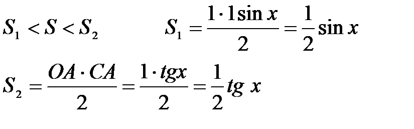 4.Первый замечательный предел (вывод). Теорема. Обозначим площади треугольника ОАВ через– S1, треугольника ОАС – S2, площадь сектора ОАВ – через S.