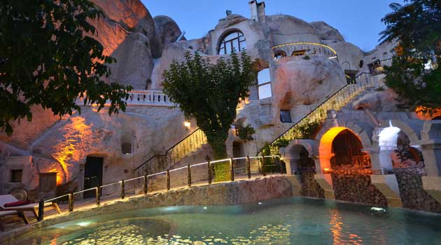 33. Gamirasu cave (Турция, г. Ургюп) Отель Гамирасу открыл свои двери в 1999 году, в качестве первого пещерного отеля в регионе. Гостиница располагает 33-мя номерами, которые были тщательно отреставрированы и по-новому оформлены. Гамирасу расположен в самом сердце Каппадокии, в деревне Айвалы, близ древнего города Ургюпа. Номера и цены Королевский люкс в византийском стиле - 1200 евро/сутки Королевский люкс в римском стиле — 550 евро/сутки Номер — люкс «Eagle Nest” («Орлиное гнездо») - 390 евро/сутки Номер — люкс в хеттском стиле — 340 евро/сутки Улучшенный люкс — 310 евро/сутки Пещерный номер — люкс - 275 евро/сутки Улучшенный семейный люкс — 390 евро/сутки Семейный номер — люкс — 275 евро/сутки Номер Делюкс — 205 евро/сутки Услуги: Курсы турецкой кухни Йога и массажная терапия Представление кружащихся дервишей (т. е. духовные обряды, ритуальные танцы)