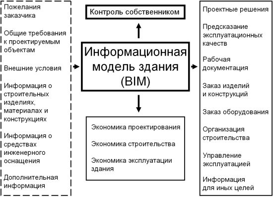 Моделирование в строительстве и архитектуре В современных условиях стало невозможно эффективно обрабатывать прежними средствами хлынувший на проектировщиков огромный (и неуклонно возрастающий) поток «информации для размышления», предваряющей и сопровождающей моделирование и проектирование. Причем поток этой информации не прекращается даже после того, как здание уже спроектировано и построено и начинается активная фаза «жизненного цикла» здания. Подход к проектированию зданий через их информационное моделирование предполагает сбор и комплексную обработку всей архитектурно-конструкторской, технологической, экономической и иной информации о здании со всеми ее взаимосвязями и зависимостями, когда здание и все, что имеет к нему отношение, рассматриваются как единый объект. Правильное определение этих взаимосвязей, а также точная классификация, хорошо организованное структурирование и достоверность используемых данных – залог успеха информационного моделирования. Новый подход к проектированию объектов получил название Информационное моделирование зданий или сокращенно BIM (от принятого в английском языке термина Building Information Modeling). На сегодняшний день термин BIM, получивший в мире всеобщее признание и широкое распространение, считается доминирующим в области строительства и архитектуры. Что понимается под BIM Информационная модель здания (BIM) – это числовая информация о проектируемом или уже существующем объекте: – хорошо скоординированная, согласованная и взаимосвязанная; – поддающаяся расчетам и анализу; – имеющая геометрическую привязку; – пригодная к компьютерному использованию; – допускающая необходимые обновления BIM может использоваться для: – принятия конкретных проектных решений; – создания высококачественной проектной документации; – предсказания эксплуатационных качеств объекта; – составления смет и строительных планов; – заказа и изготовления материалов и оборудования; – управления возведением здания; – управления и эксплуатации самого здания и средств технического оснащения в течение всего жизненного цикла; – управления зданием как объектом коммерческой деятельности; – проектирования и управления реконструкцией или ремонтом здания; + сноса и утилизации здания; – иных связанных со зданием целей. Схематически информация, относящаяся к BIM, поступающая в модель и получаемая из модели, показана на рис.1. Аббревиатура BIM может использоваться как для обозначения непосредственно самой информационной модели здания, так и для процесса информационного моделирования.