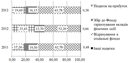 Рис. 2.7 - Динаміка структури податкових платежів ПАТ АБ «СТОЛИЧНИЙ» за 2011-2013 рр., %