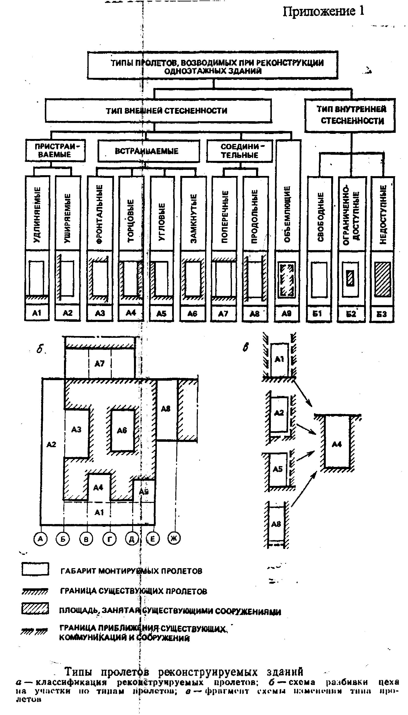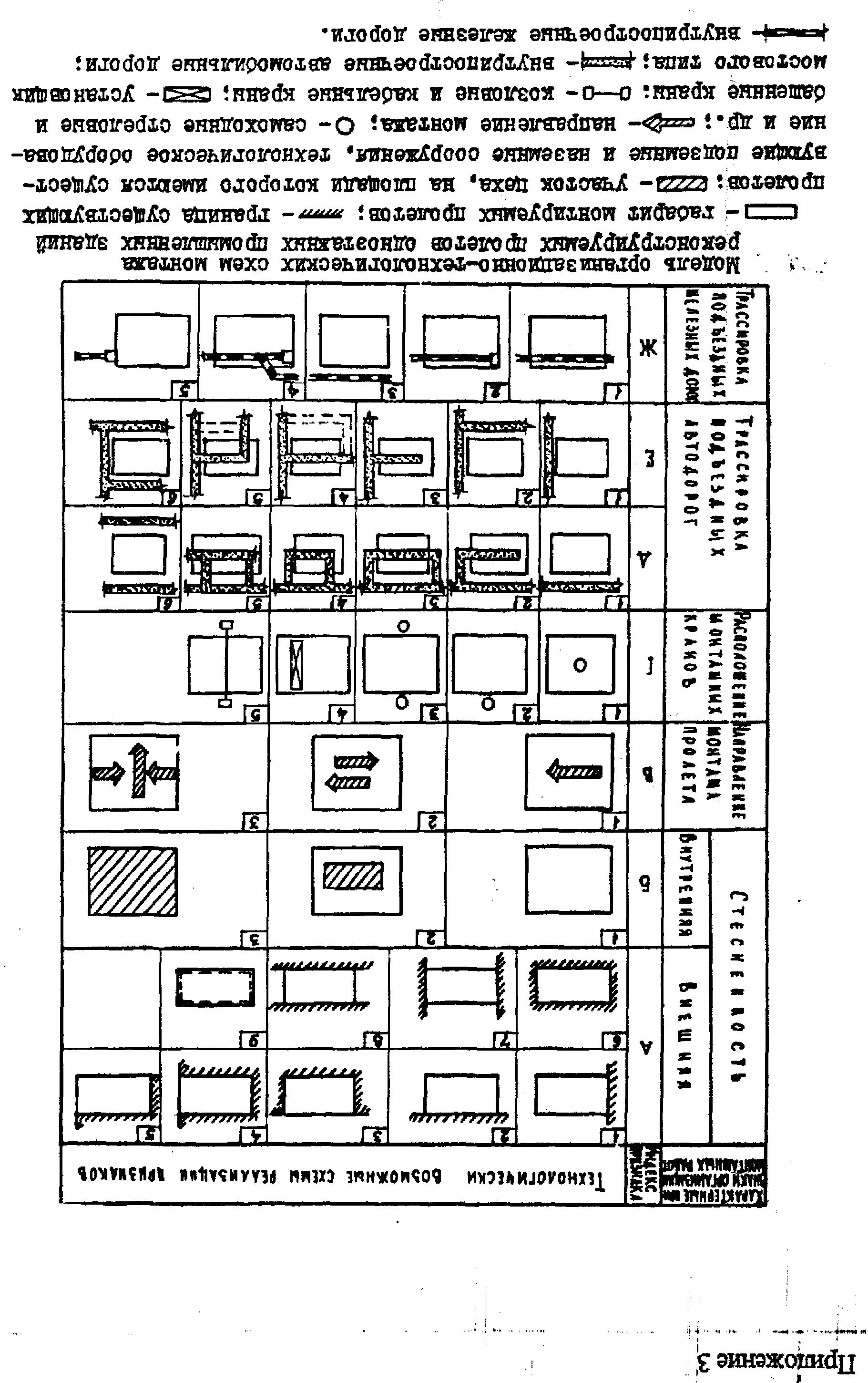 На основании выполненного выбора и обоснования схемы механизации демонтажа и монтажа конструкций в графической части проектируется в плане объемно-планировочное решение реконструируемого участка с учетом ее внутренней и внешней стесненности, путь и направление перемещения монтажного механизма (при этом указываются номера стоянок и последовательность выполнения демонтажно-монтажных работ), постоянные и временные автодороги для транспортировки строительных конструкций, площадки складирования и укрупнительной сборки конструкций. Монтажные схемы производства работ по монтажу и демонтажу конструкций В поперечном разрезе определяются места установки монтажных механизмов относительно монтируемых и демонтируемых конструкций, зоны их складирования, предусматриваются мероприятия по технике безопасности при производстве демонтажно-монтажных работ. График производства демонтажа-монтажа строительных конструкций В основу построения графика положены данные таблицы 2. Номенклатура конструктивных работ приведена в задании (исходные данные). Состав операций по каждому виду работ приводится в соответствующих сборниках ЕНиР 5-1 и 4-1. В графике приводится продолжительность выполнения всех видов демонтажно-монтажных работ (дн.) с учетом совмещения их во времени и условий основной деятельности реконструируемого объекта. Графики производства работ составляются для каждого сравниваемого варианта. Объектный стройгенплан Объектный стройгенплан разрабатывается с учетом заданных условий реконструкции, на основании исходных данных в «Методических указаниях к курсовому проекту по «Организации строительства» и при его проектировании пользуются рекомендациями, приведенными в этих методических указаниях.