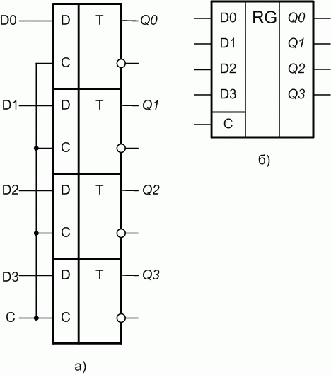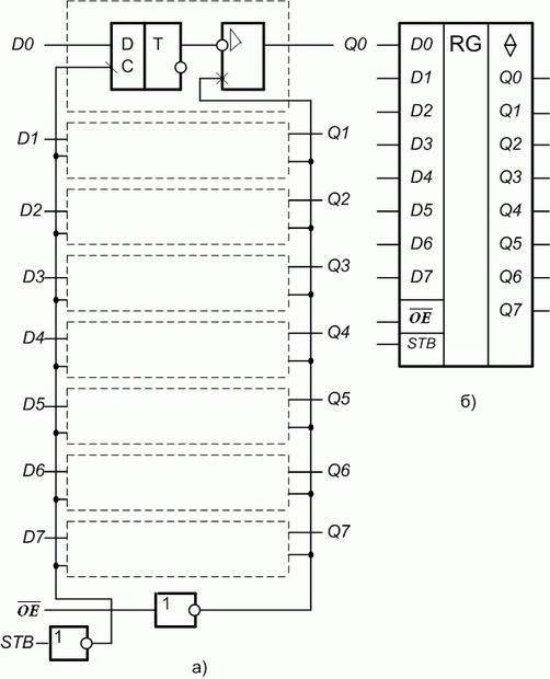 16. Основные компоненты памяти: защелки, триггеры, регистры. Простейший регистр представляет собой параллельное соединение нескольких триггеров (рис. 8.1,а). УГО регистра-защелки приведена на рис. 8.1,б. Если регистр построен на триггерах-защелках, то его называют регистр- "защелка". Как правило, в состав ИС регистра входят буферные усилители и элементы управления, например как показано на рис. 8.2,а. Здесь изображена функциональная схема 8-разрядного D -регистра-защелки КР580ИР82 с тремя состояниями на выходе. Его УГО представлено на рис. 8.2,б.