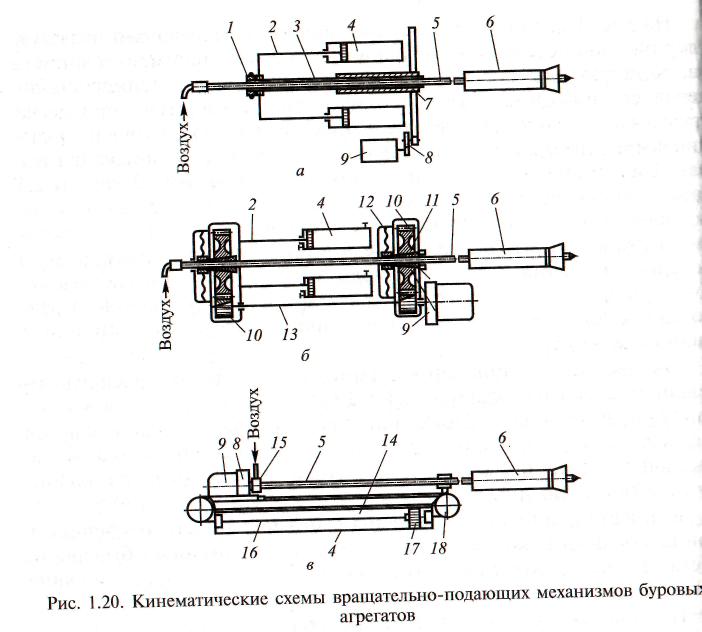 Рис. Кинематические схемы вращательно-подающих механизмов буровых агрегатов. а - вращательно-подающий механизм с цилиндропоршневой системой подачи; б - вращательно-подающий механизм полуавтоматического действия; в - вращательно-подающий механизм с длиной подачи, равной длине штанги.